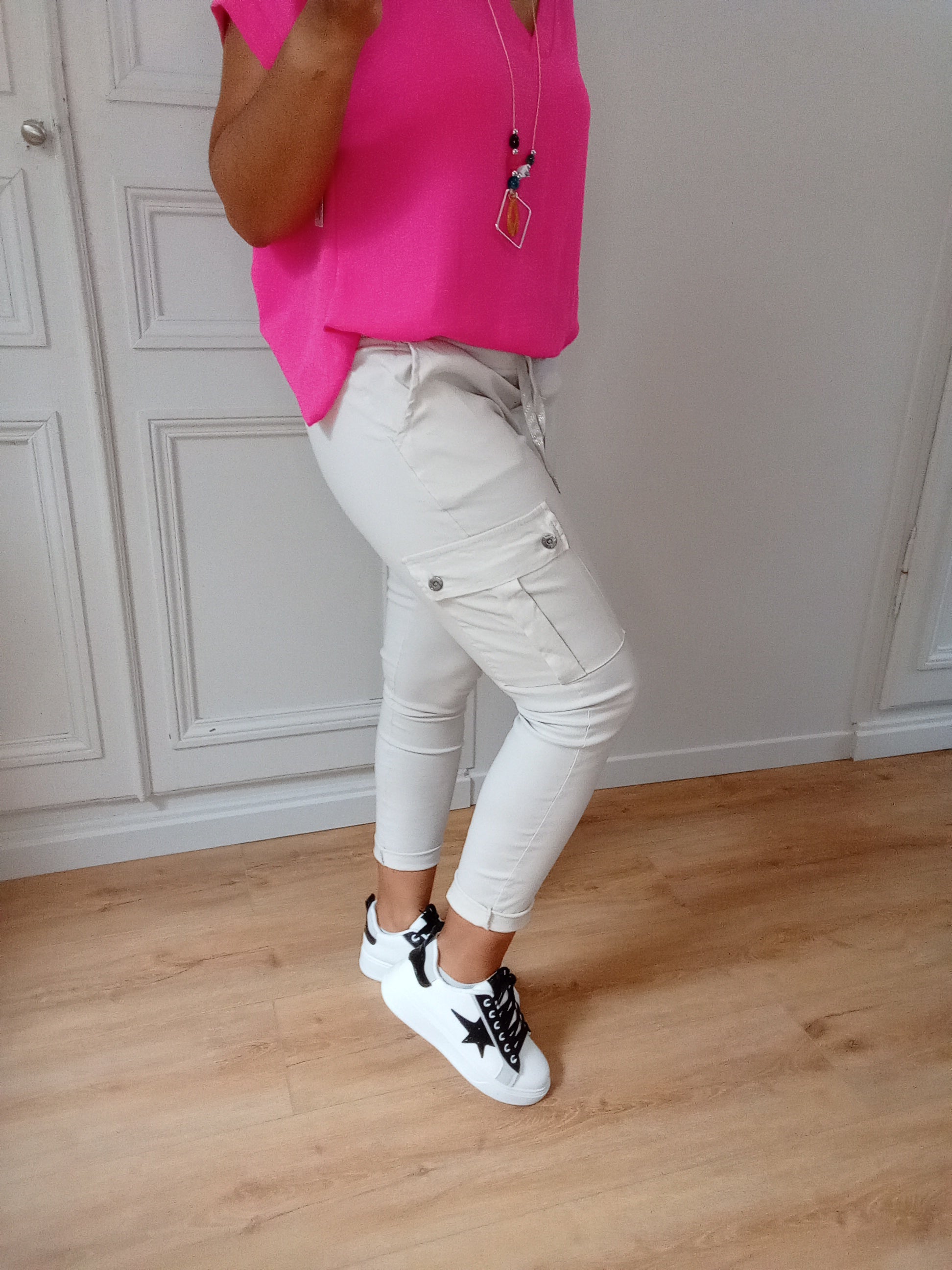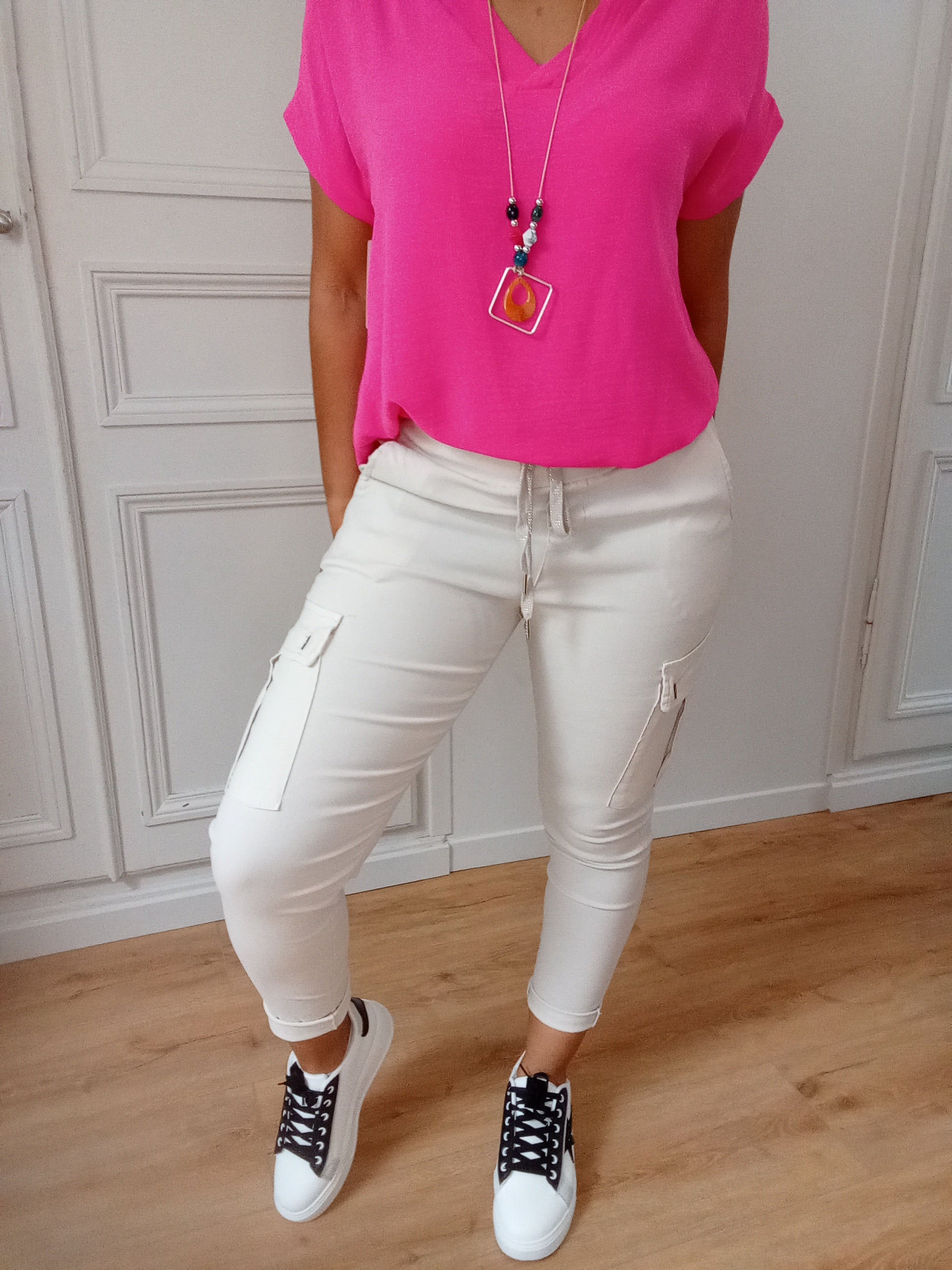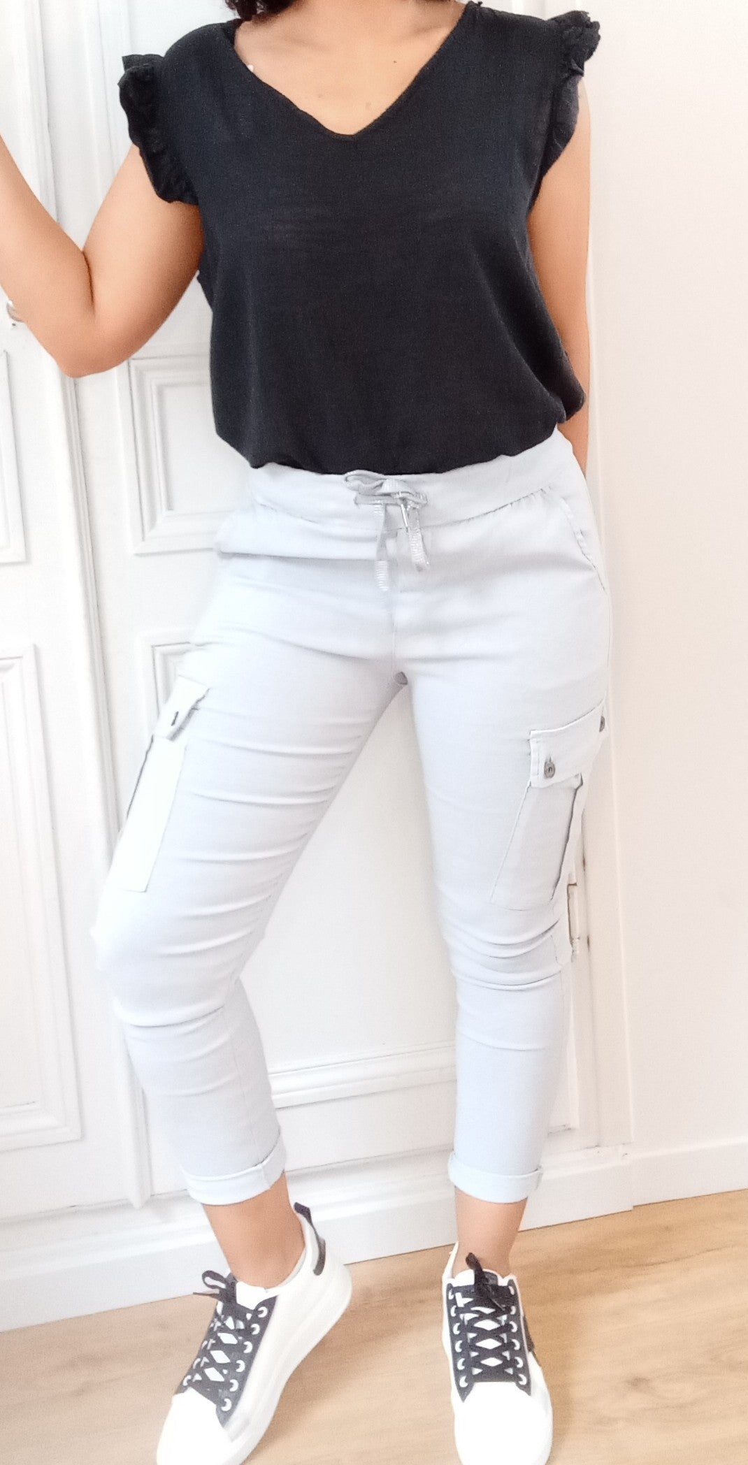 Description : Pantalon avec 4 poches et élastique à la taille ;