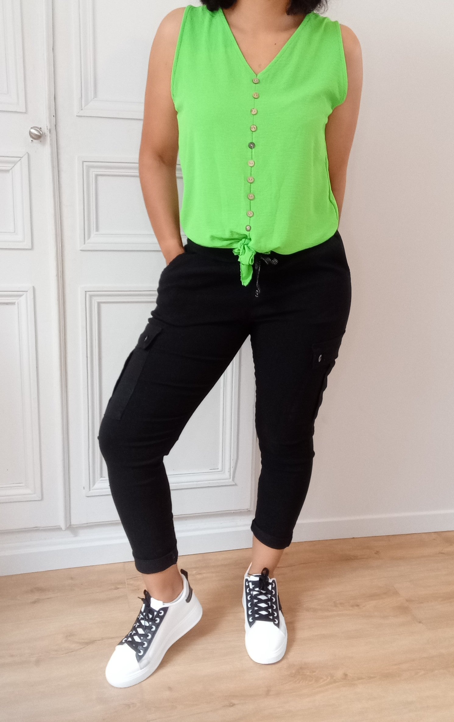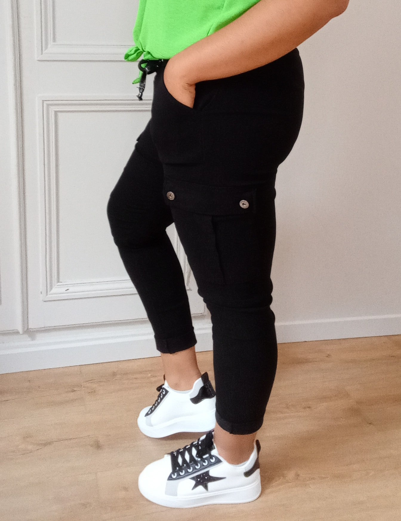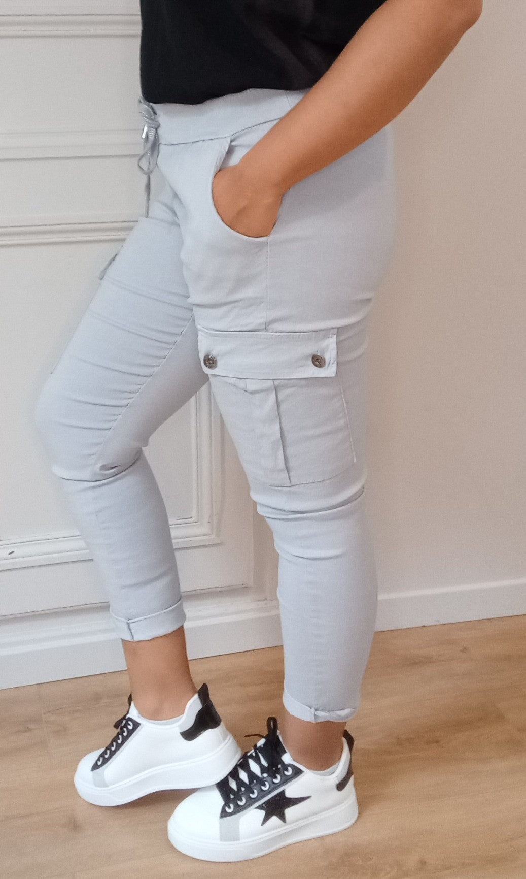 Description : Pantalon avec 4 poches et élastique à la taille ;