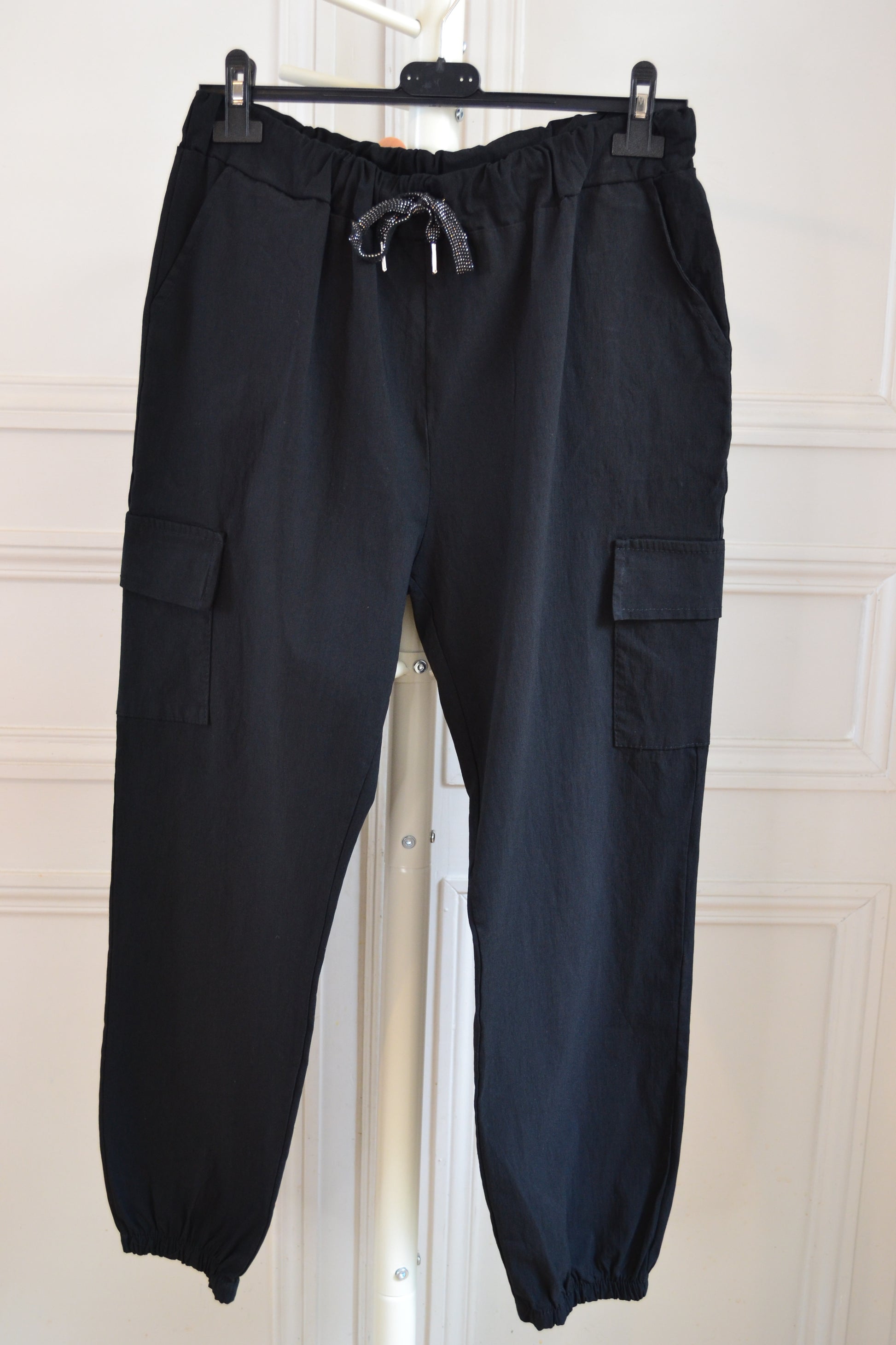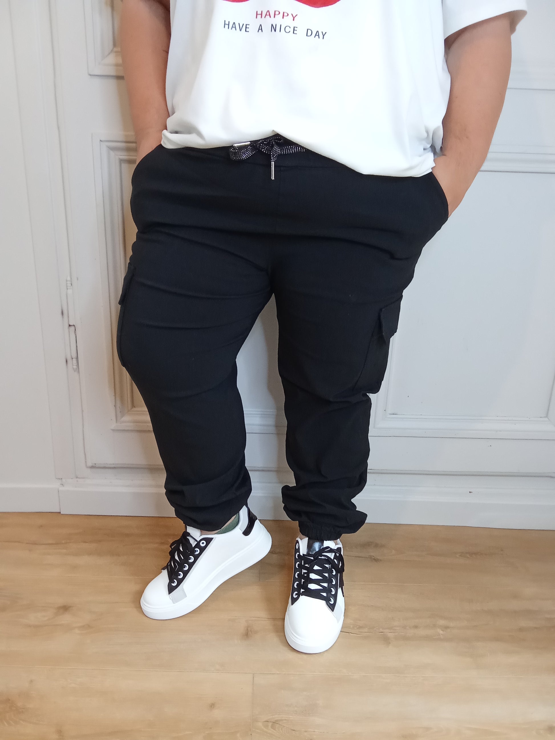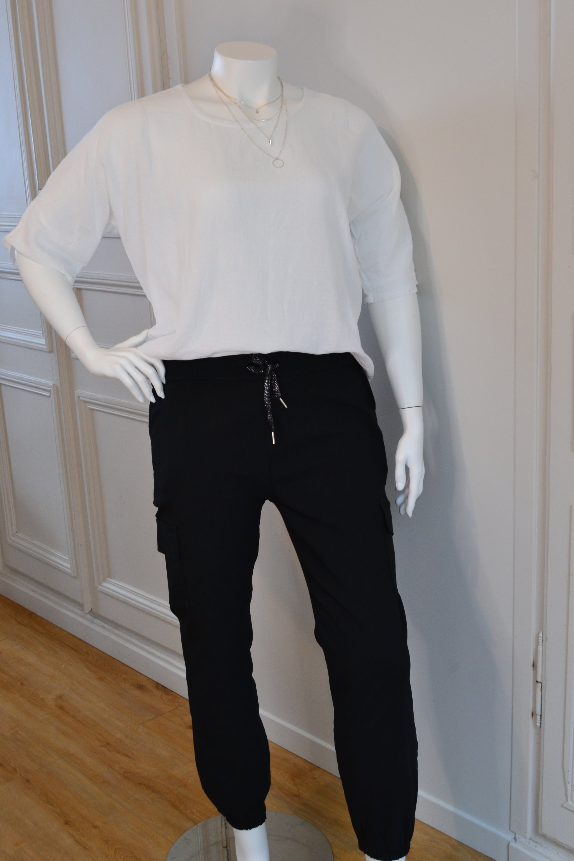Description : Pantalon avec 4 poches et élastique à la taille ;