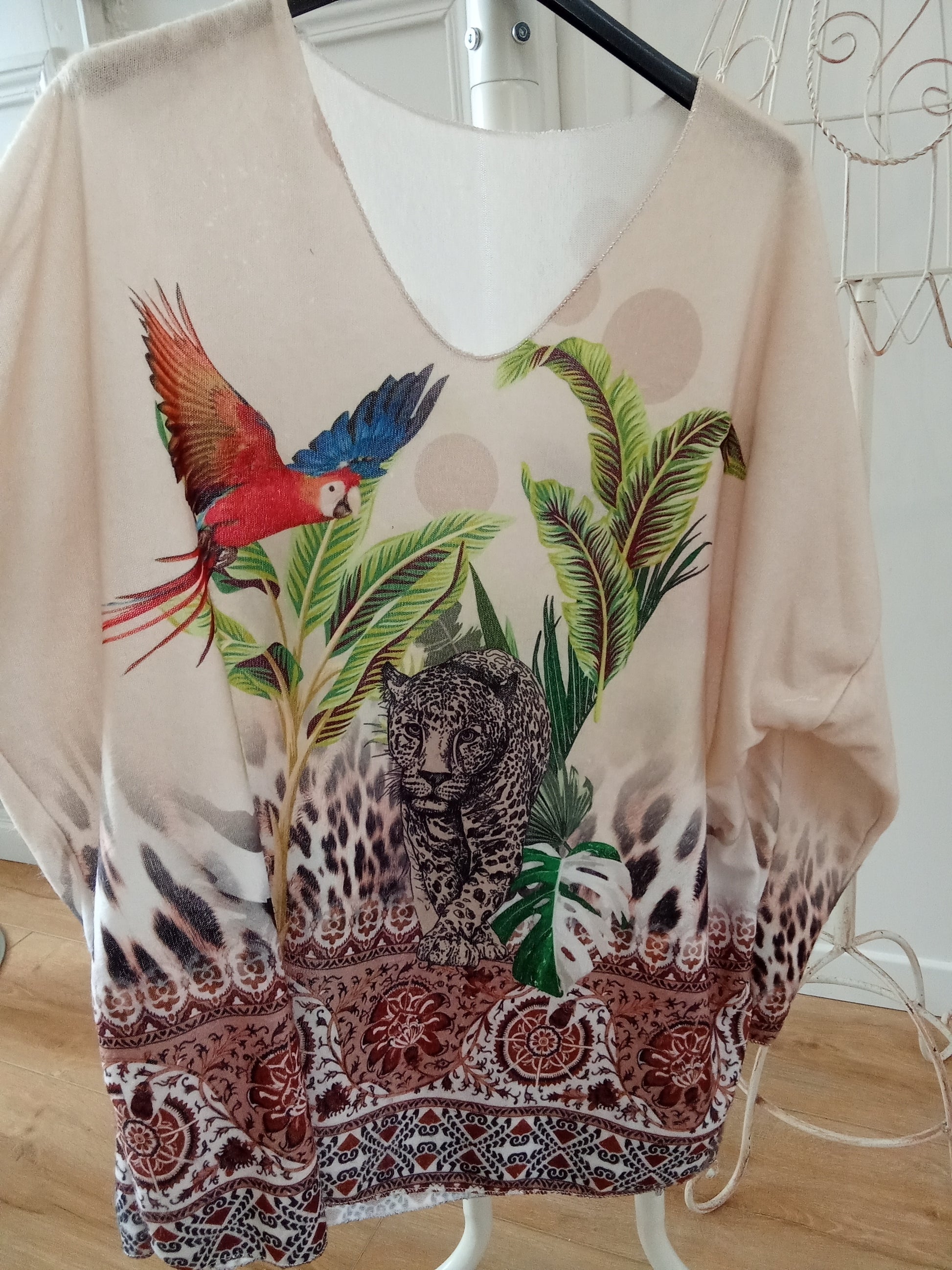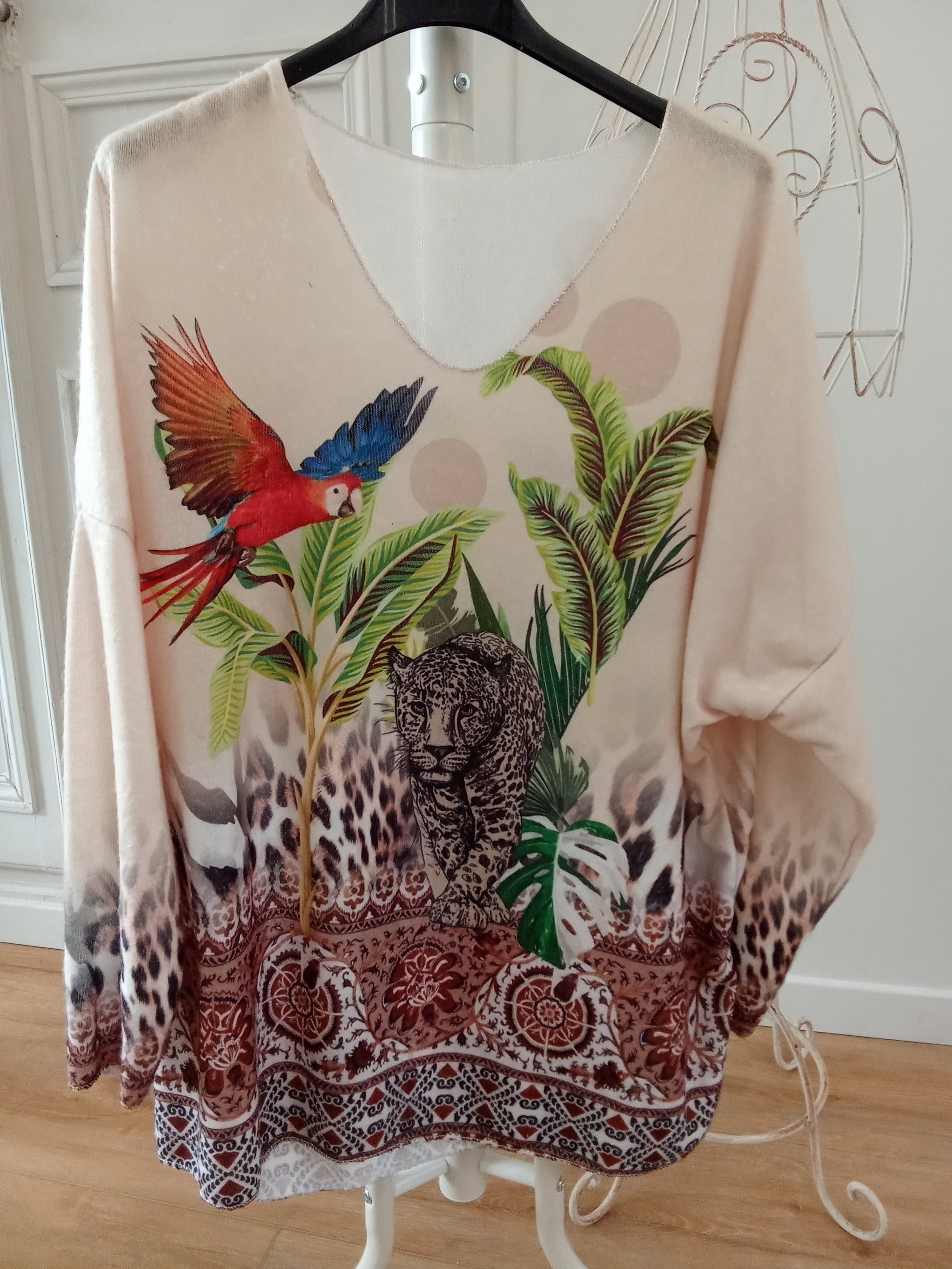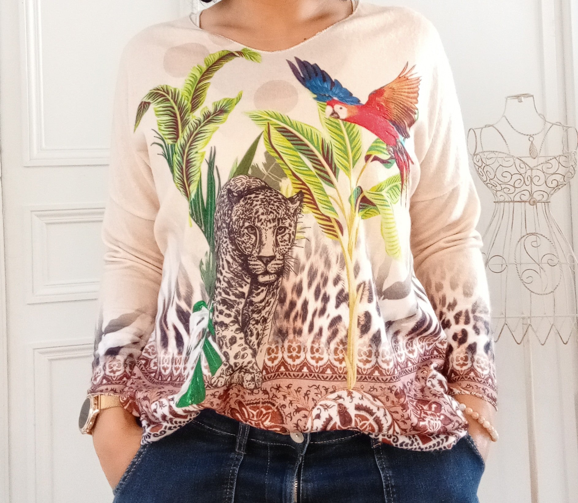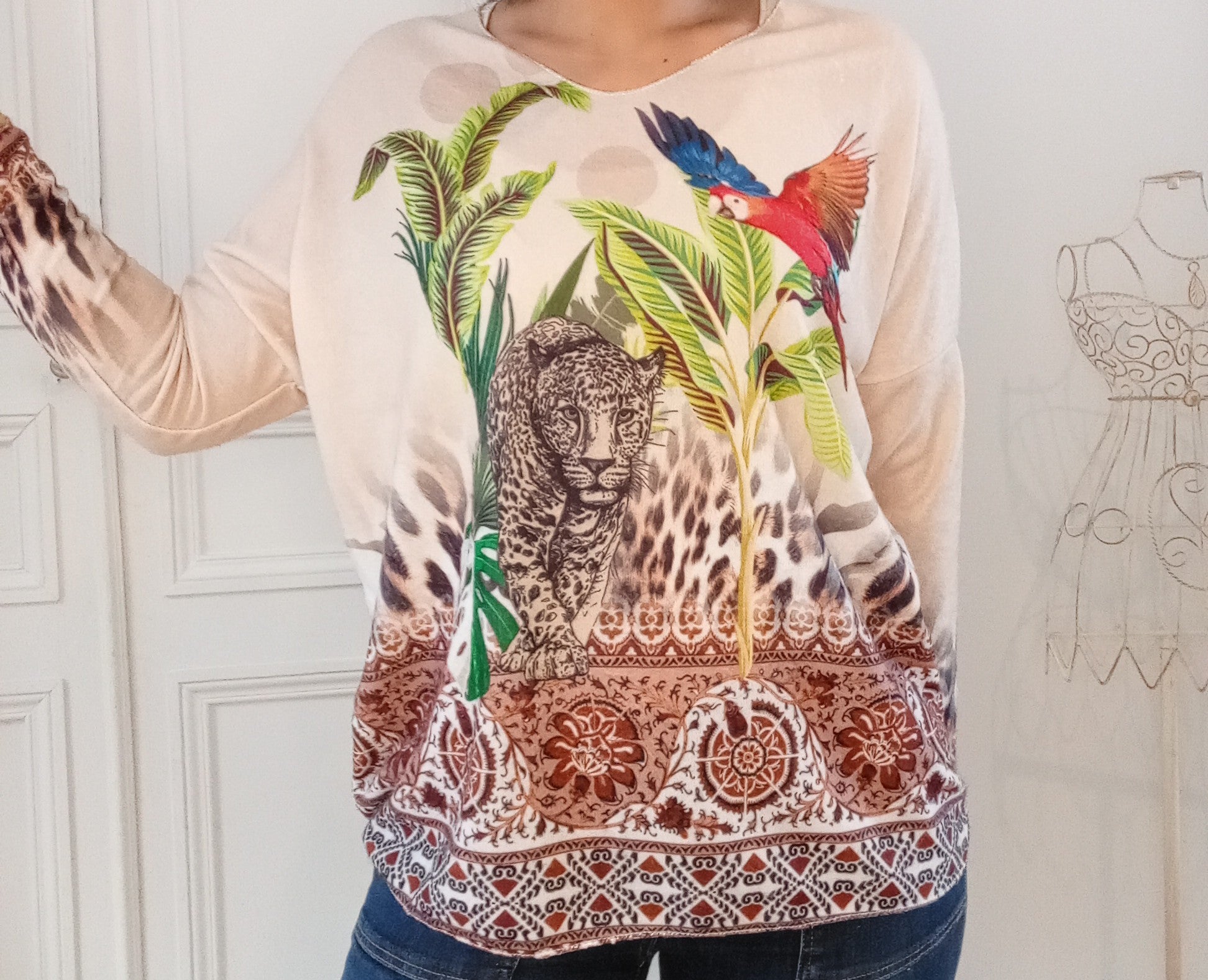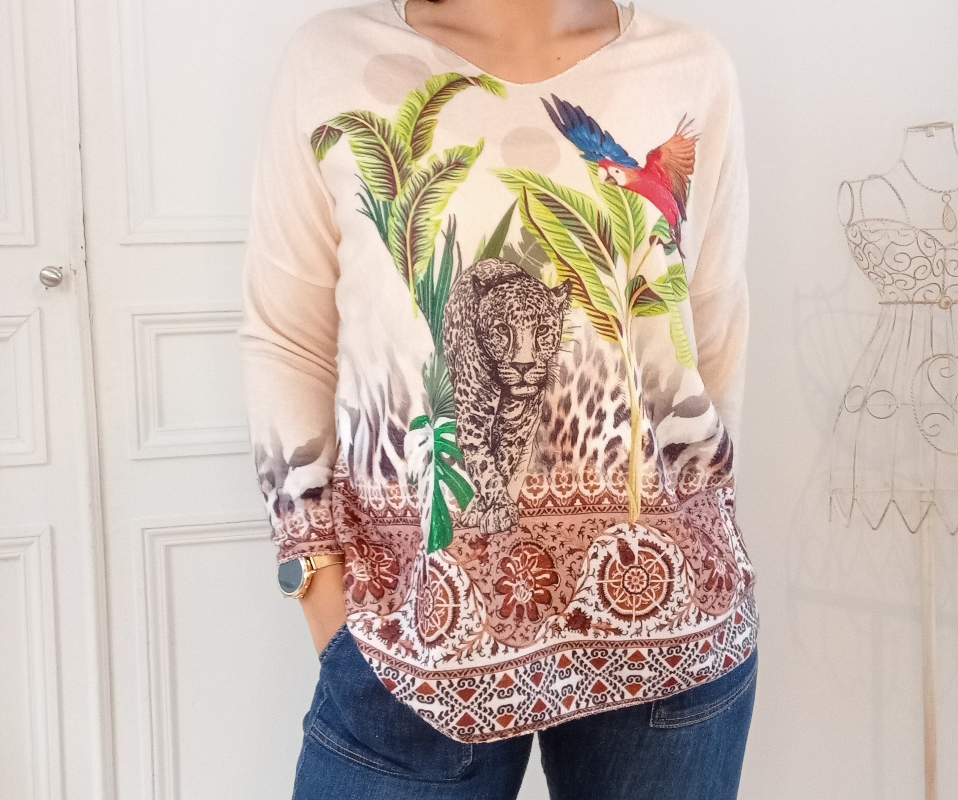 Pull imprimé en maille légère, coupe ample, col V dégagé.