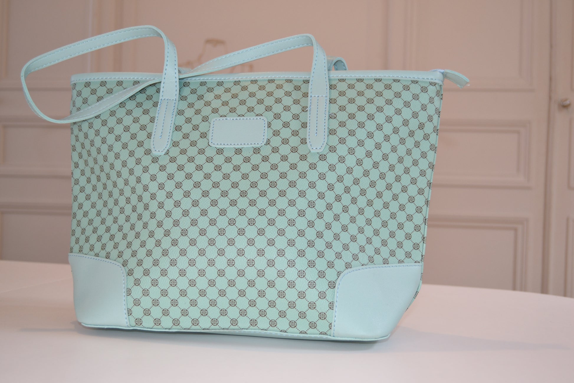 Sac à main simili cuir Bleu et motif trèfles marron, intérieur doublé en tissus avec poche fermeture éclair.