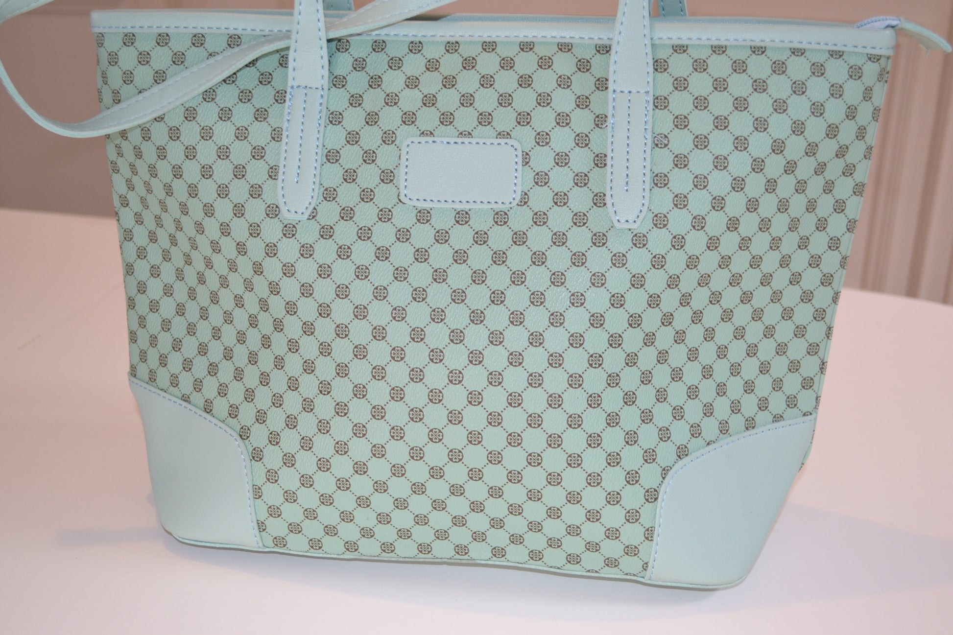 Sac à main simili cuir Bleu motif trèfles marron