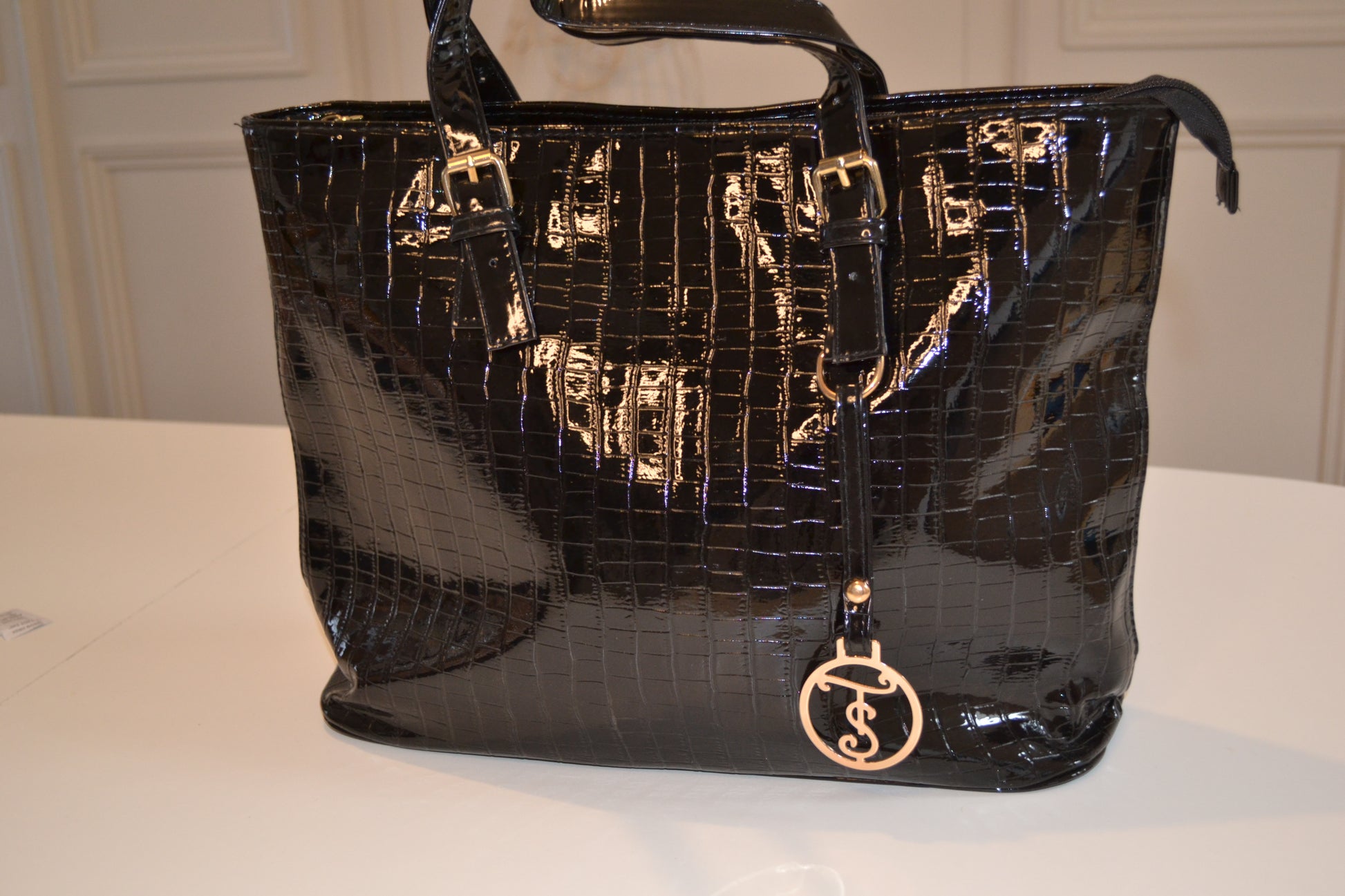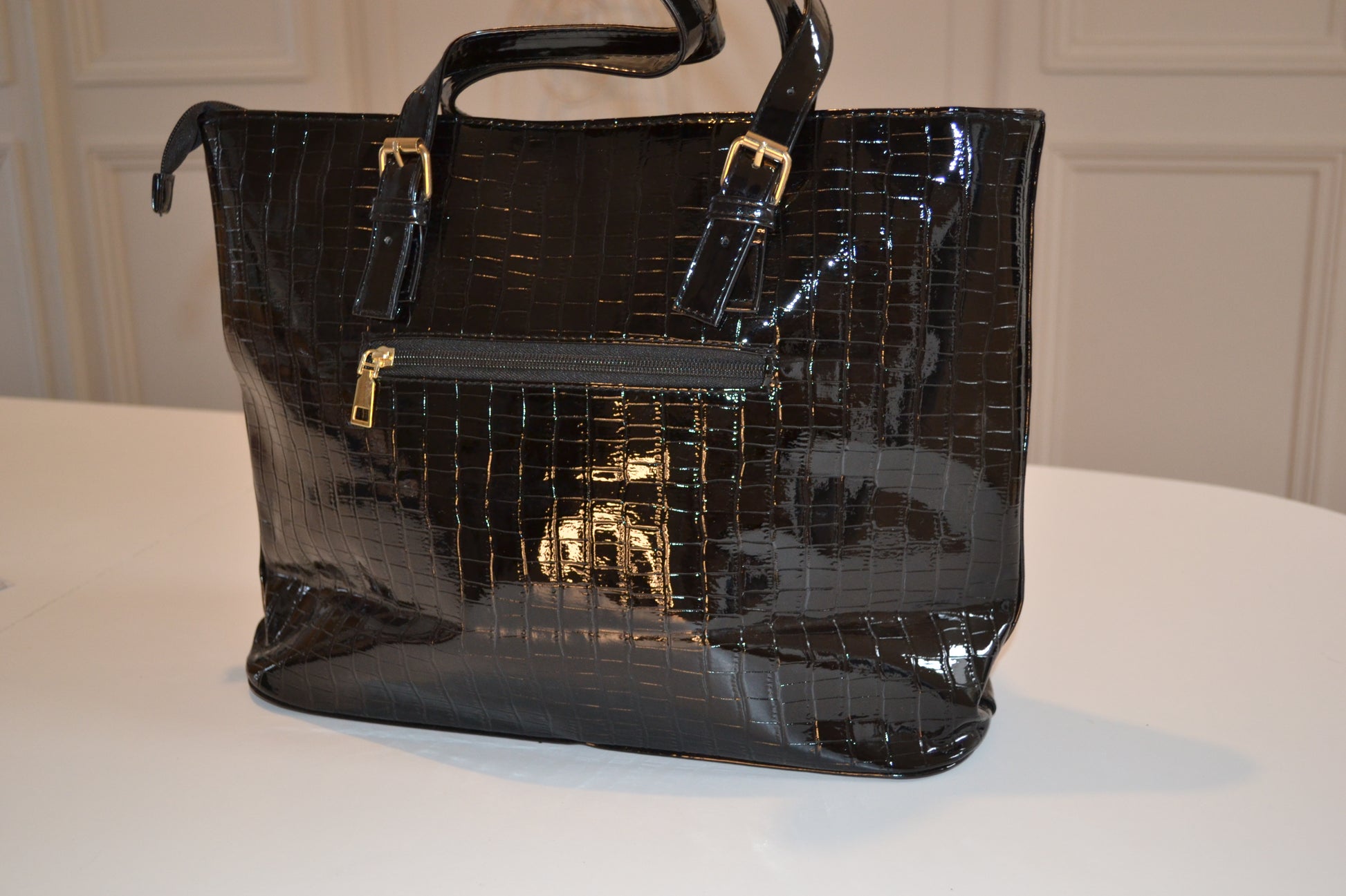 Sac à main simili cuir Noir vernis, intérieur doublé en tissus, avec poche fermeture éclair arrière interne et externe