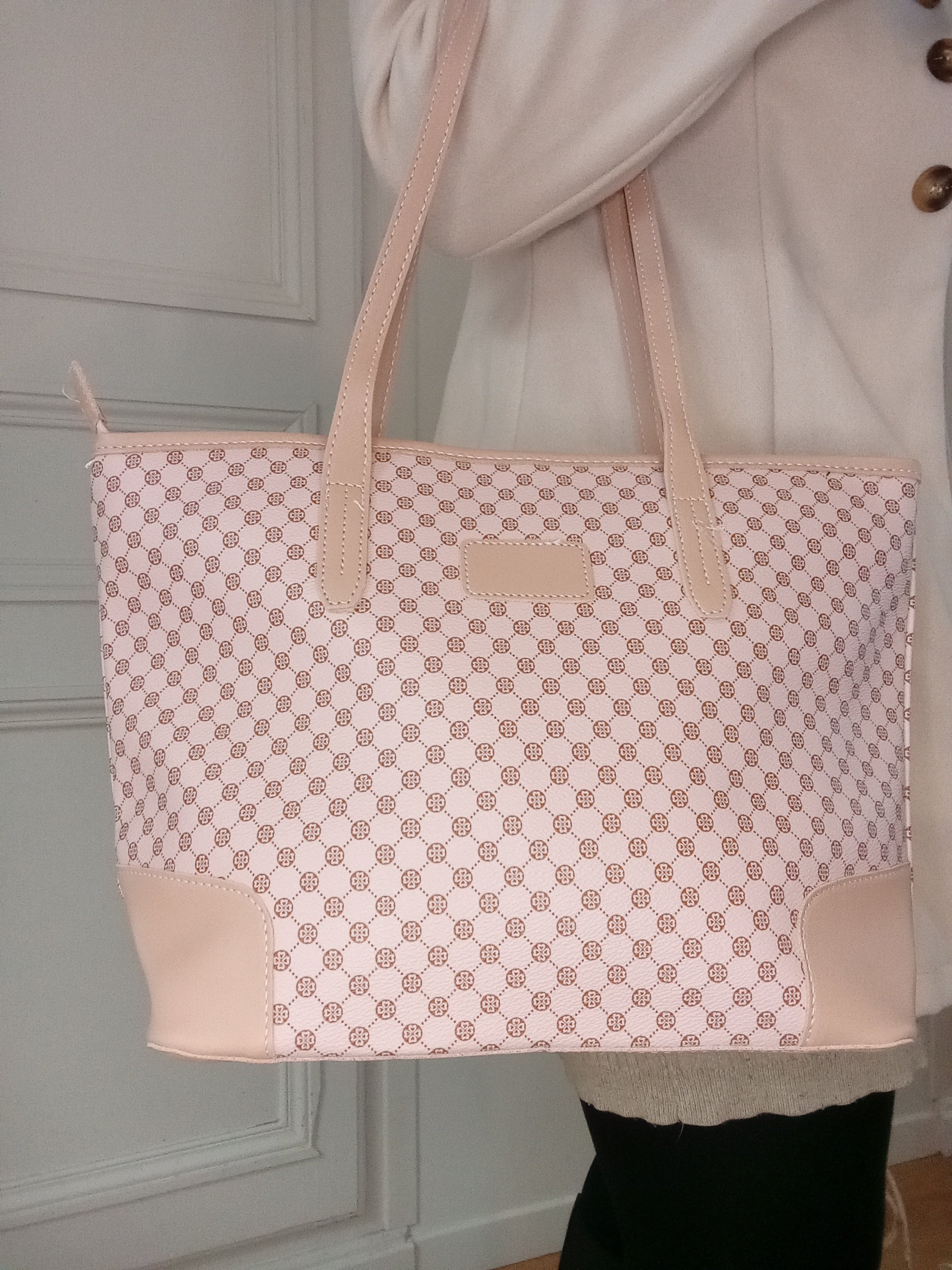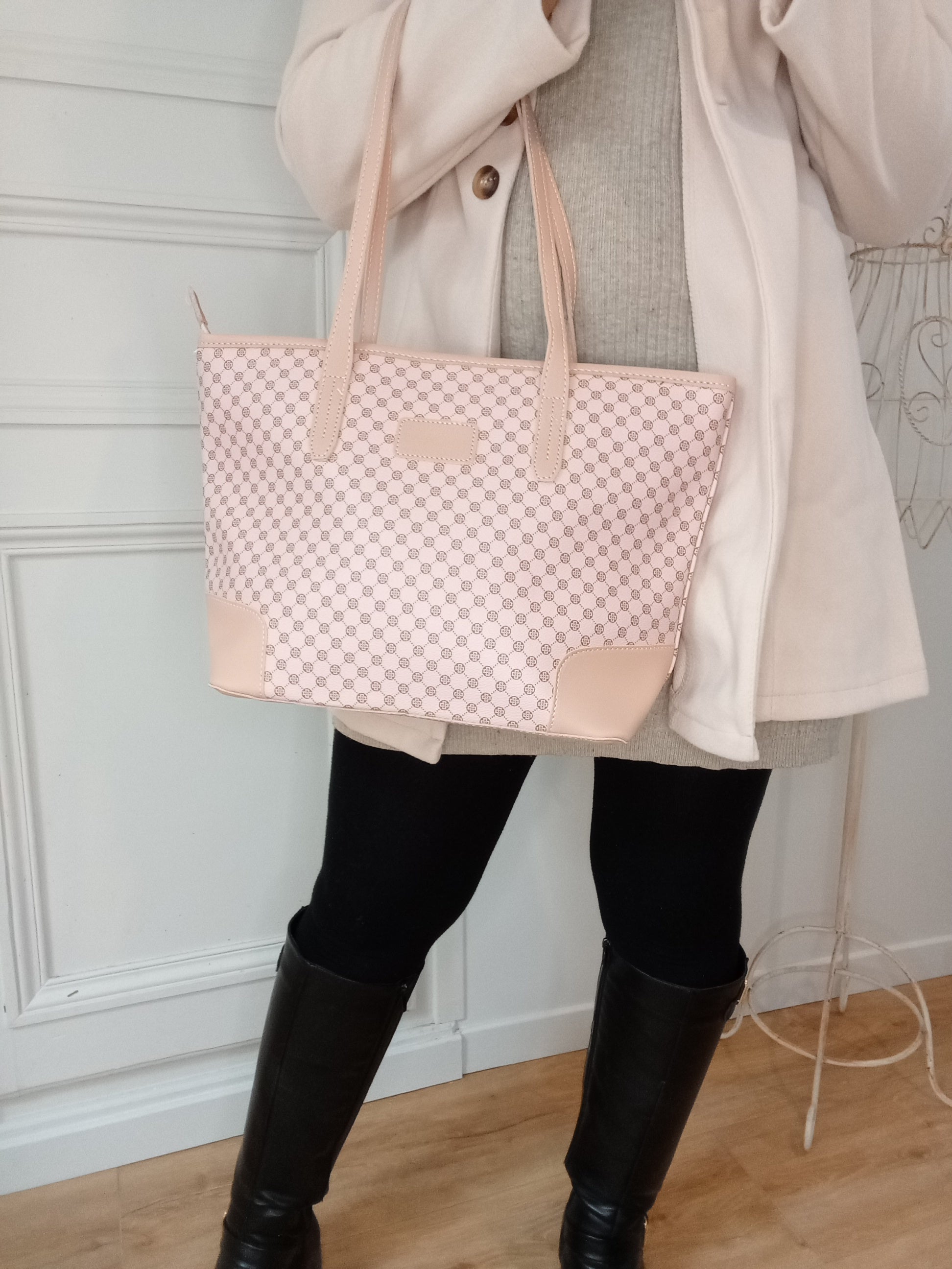 Sac à main simili cuir Rose et motif trèfles Maron, intérieur doublé en tissus avec poche fermeture éclair.